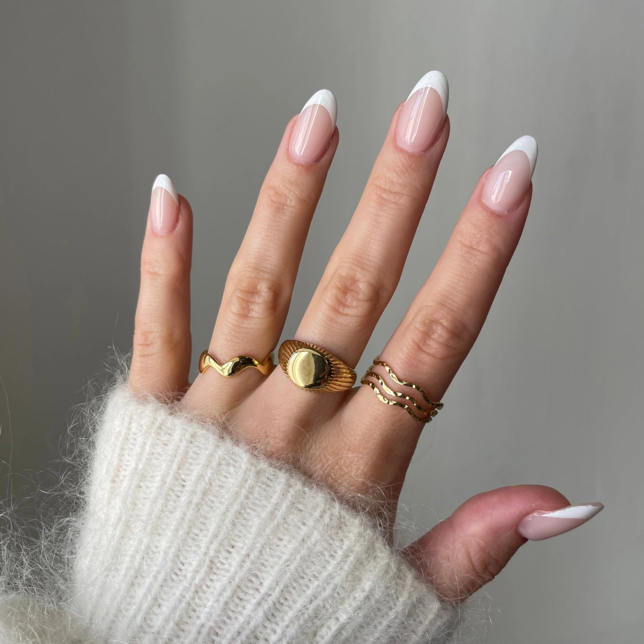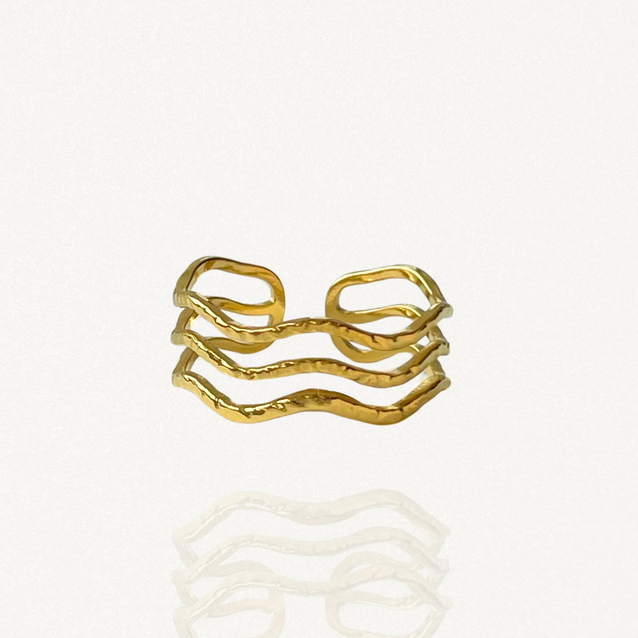 Bague vague Andrea portée en accumulation (stacking) avec une chevalière dôme lisse dorée.