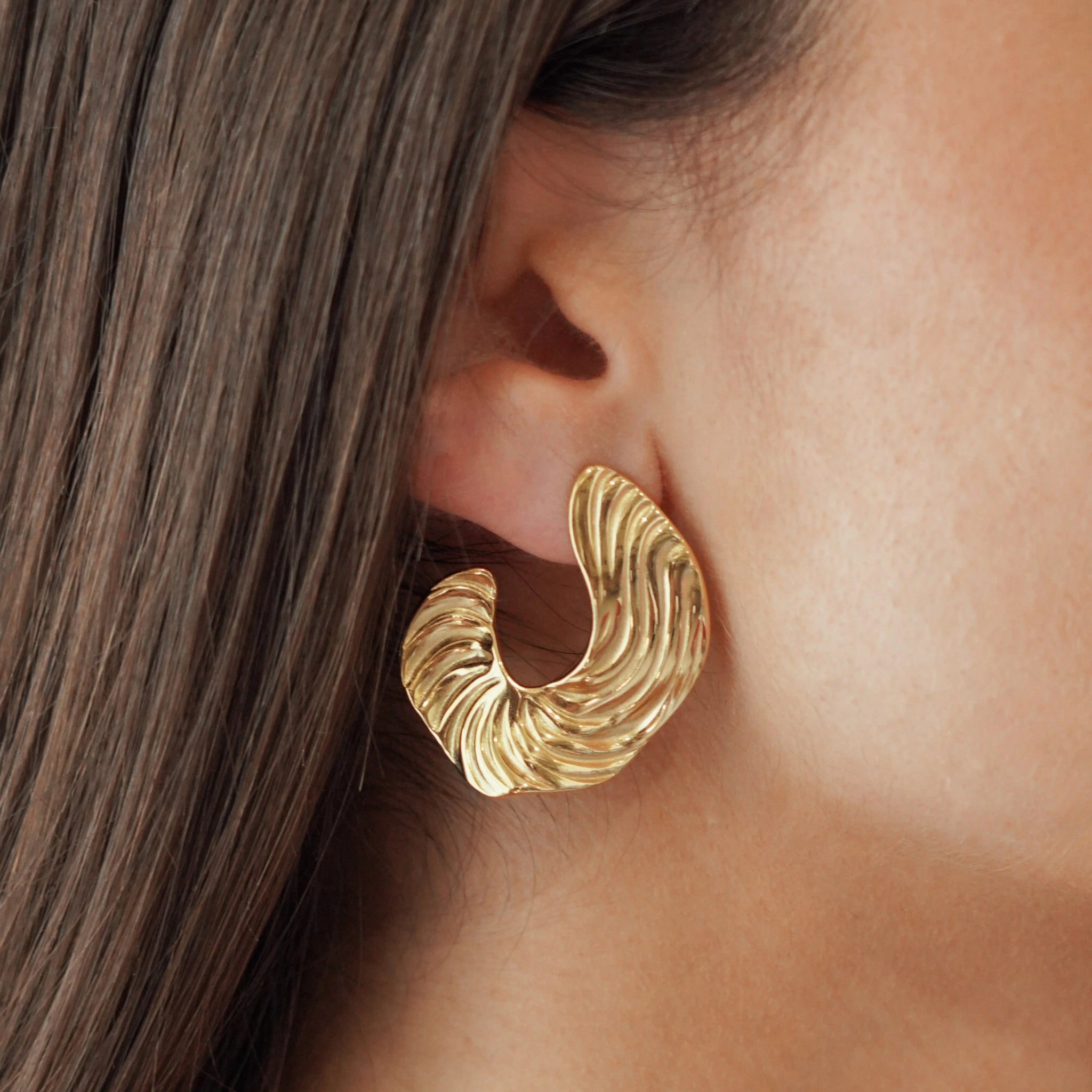 Boucles d'oreilles statement grand format forme vague ondulée et texturée en acier inoxydable doré portées à l'oreille.
