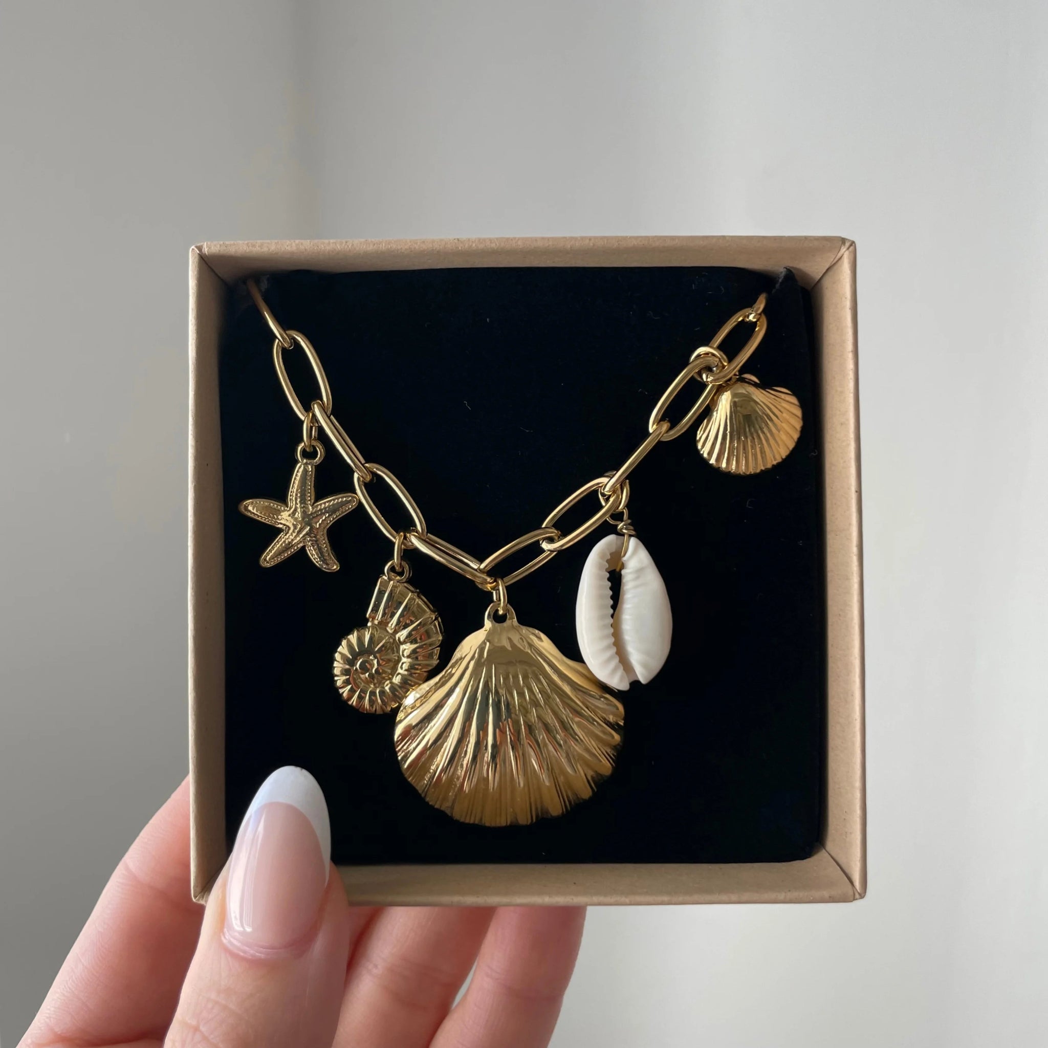 Vue d'ensemble bracelet doré à charms marins : étoile de mer, coquille Saint-Jacques et cauri naturel sur fond blanc.