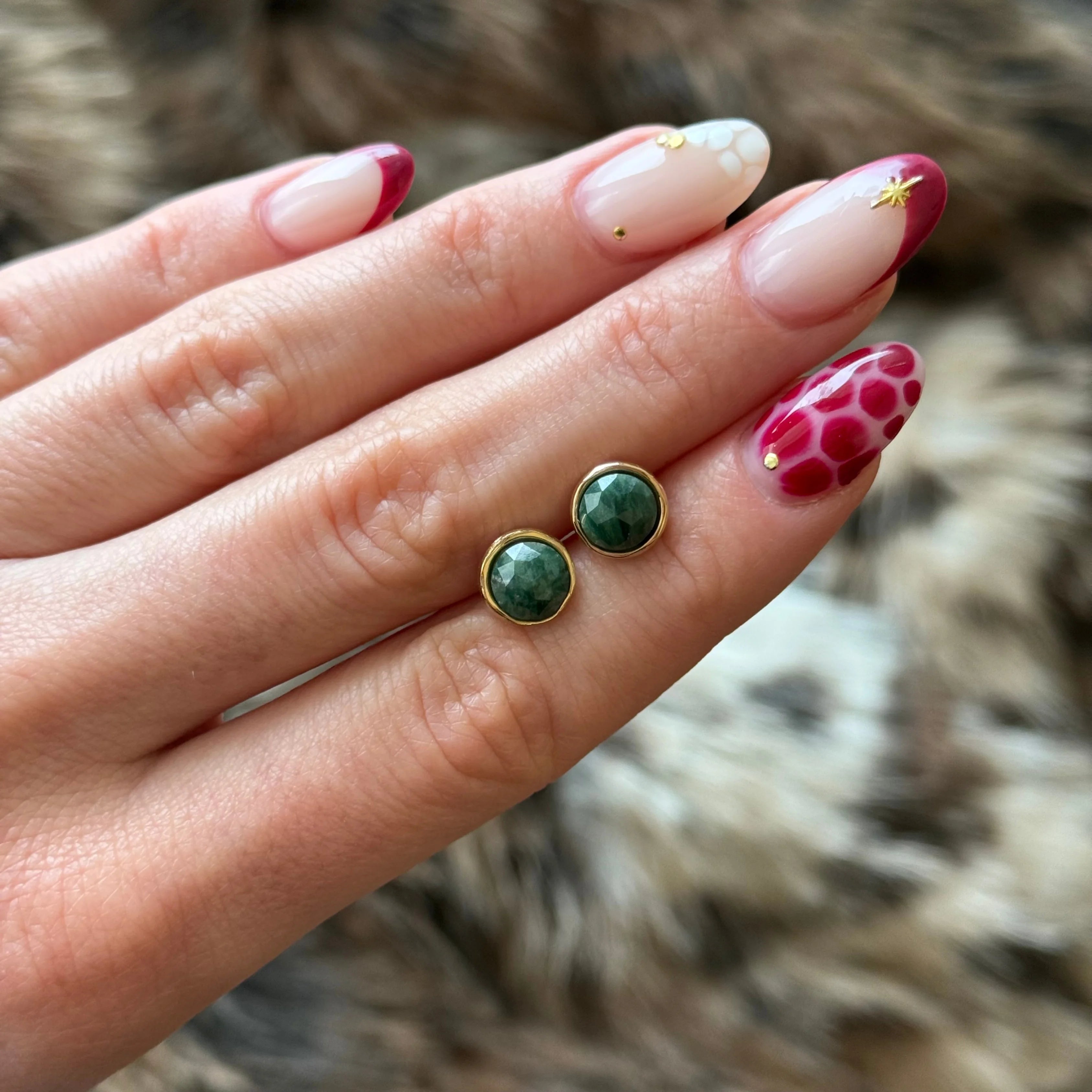 Paire de puces d'oreilles minimalistes MAISON DE L'AMOUR : pierre verte effet émeraude sertie de métal doré sur fond blanc.