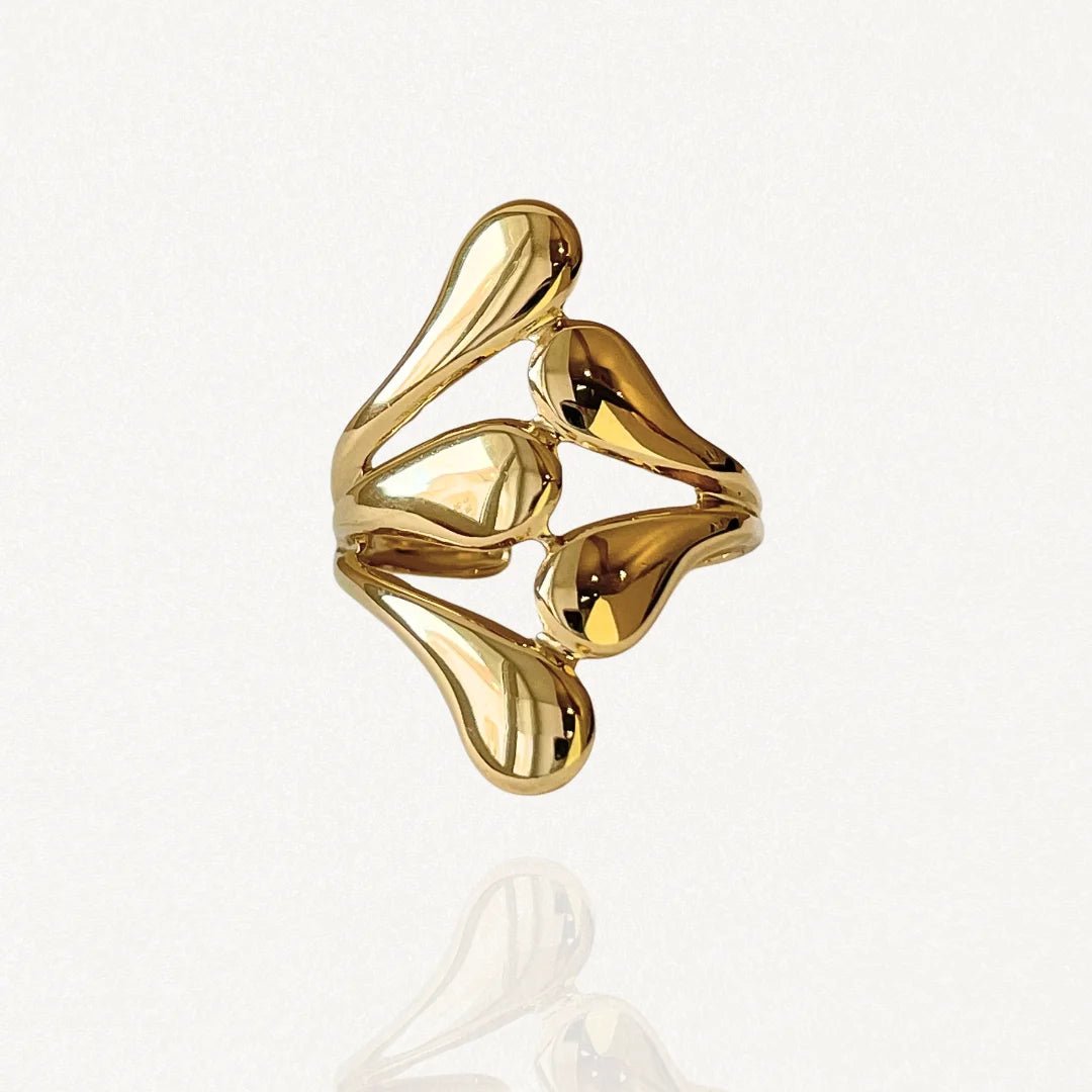 Bague large ajourée en acier inoxydable doré au design organique formé de gouttes fluides entrelacées sur fond blanc.