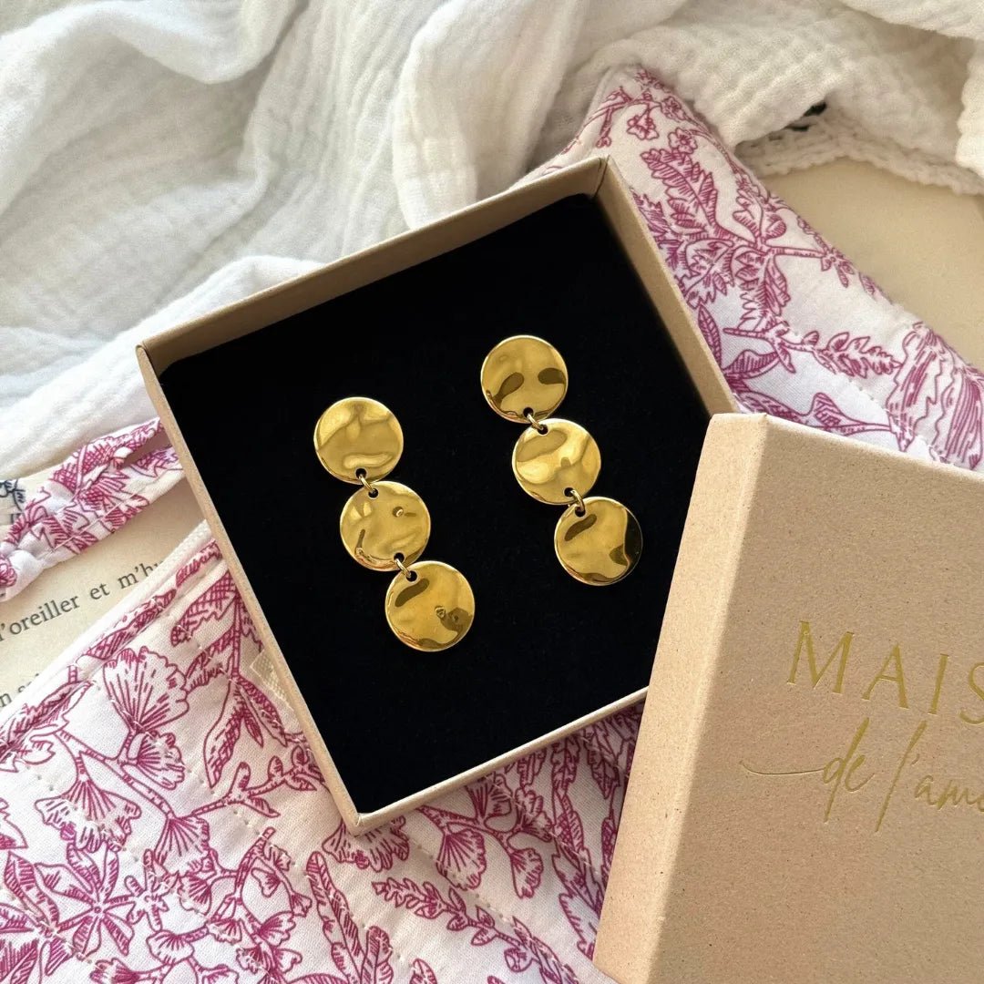 Boucles d'oreilles dorées pendantes avec 3 disques ronds martelés, présentées dans un écrin marron sur tissu blanc et fuchsia.