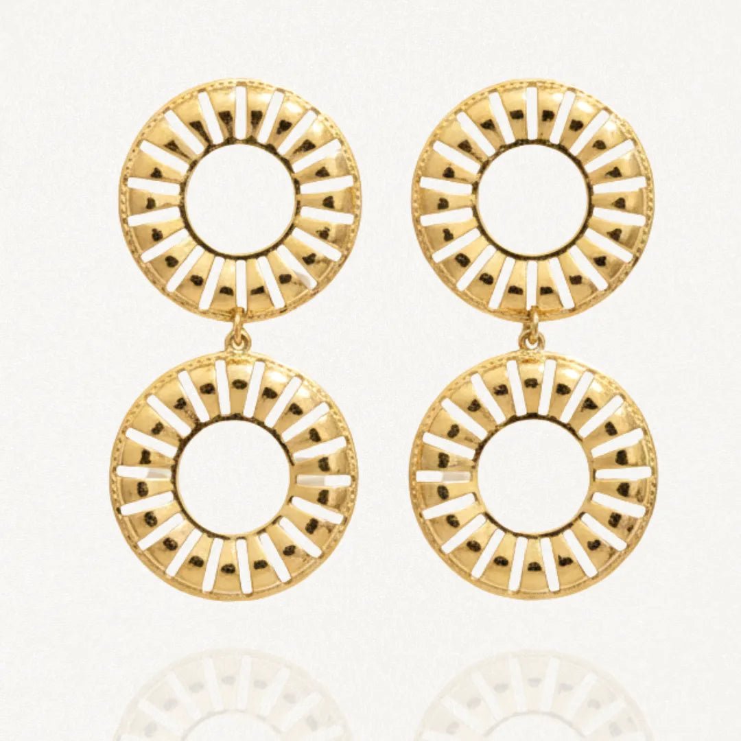 Boucle d'oreille pendante dorée, composée de deux cercles ajourés à motifs rayonnants, portée sur l'oreille droite d'une femme.
