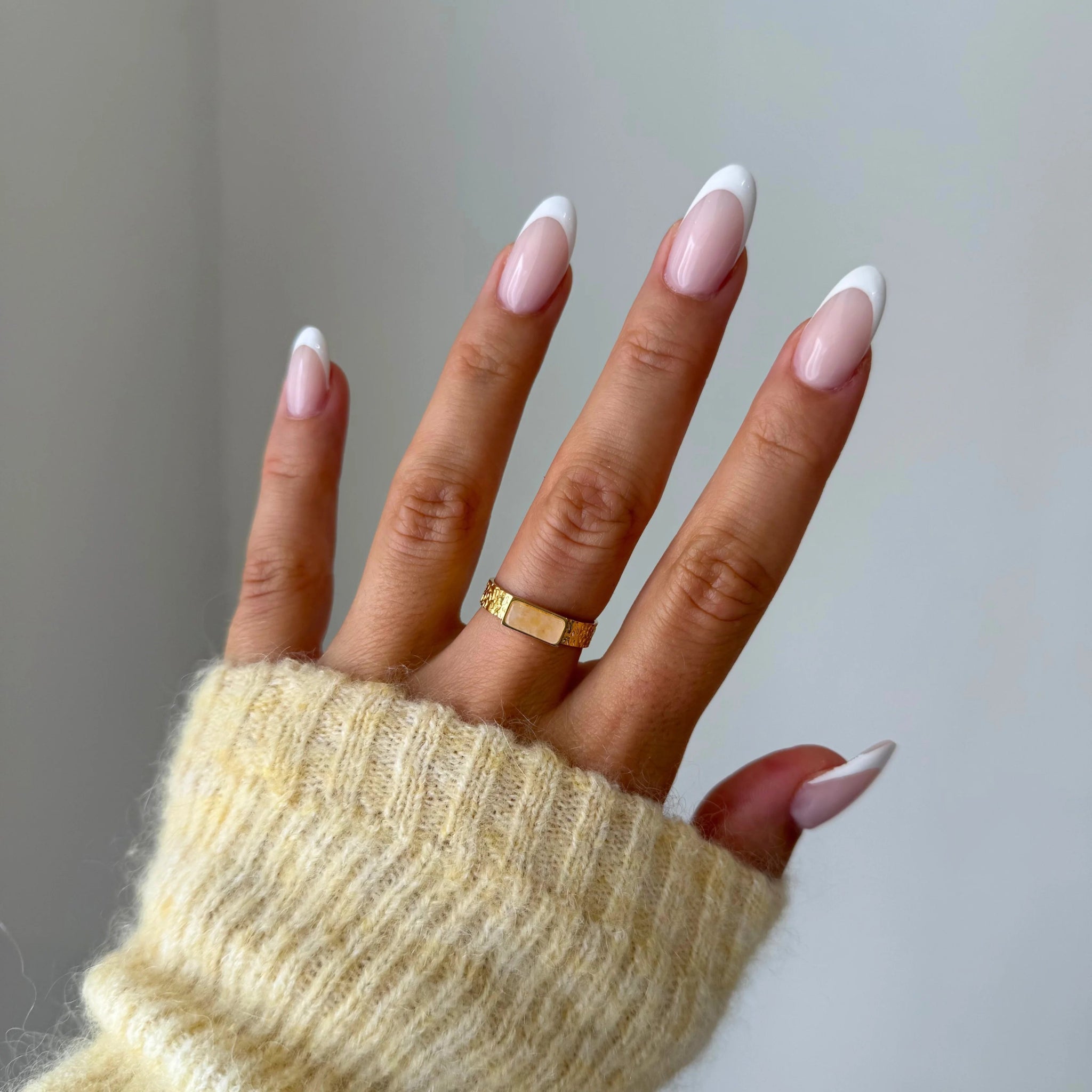 Bague Christina portée en accumulation (stacking) avec une chevalière ovale et d'autres bagues dorées.