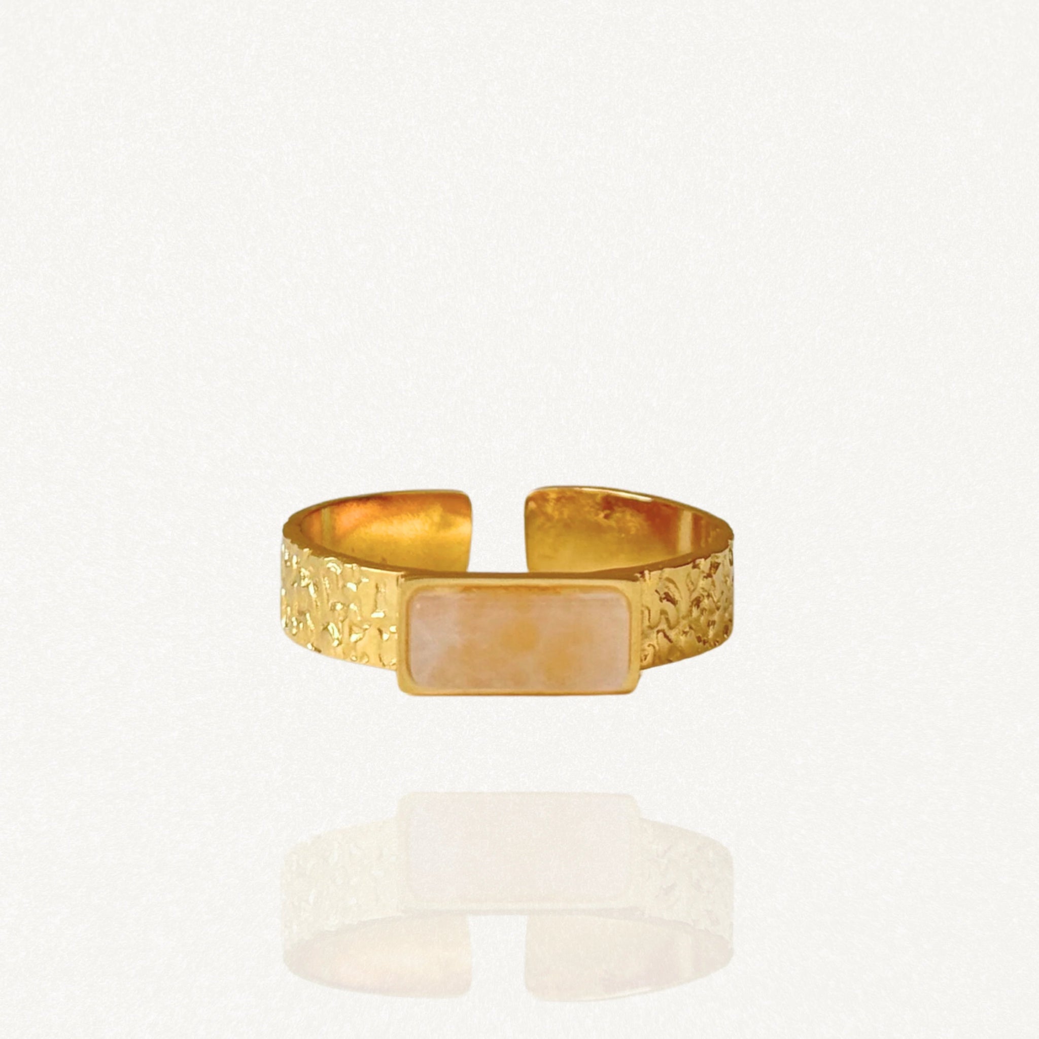 Bague bandeau ajustable en acier inoxydable doré, finition martelée, ornée d'une pierre rectangulaire horizontale beige rosée sur fond blanc.