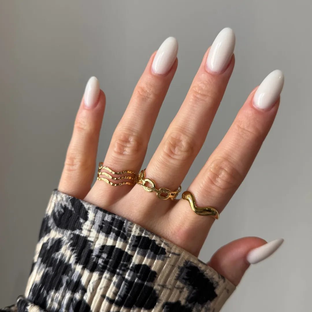 Main femme aux ongles ovales blancs, 3 bagues dorées: triple vague, chaînes entrelacées, ondulée. Manche imprimé animal B&W.