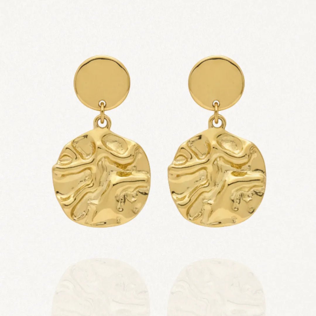 Paire de boucles d'oreilles pendantes en acier inoxydable doré, composées d'un stud rond uni et d'un large pendentif rond martelé irrégulier.