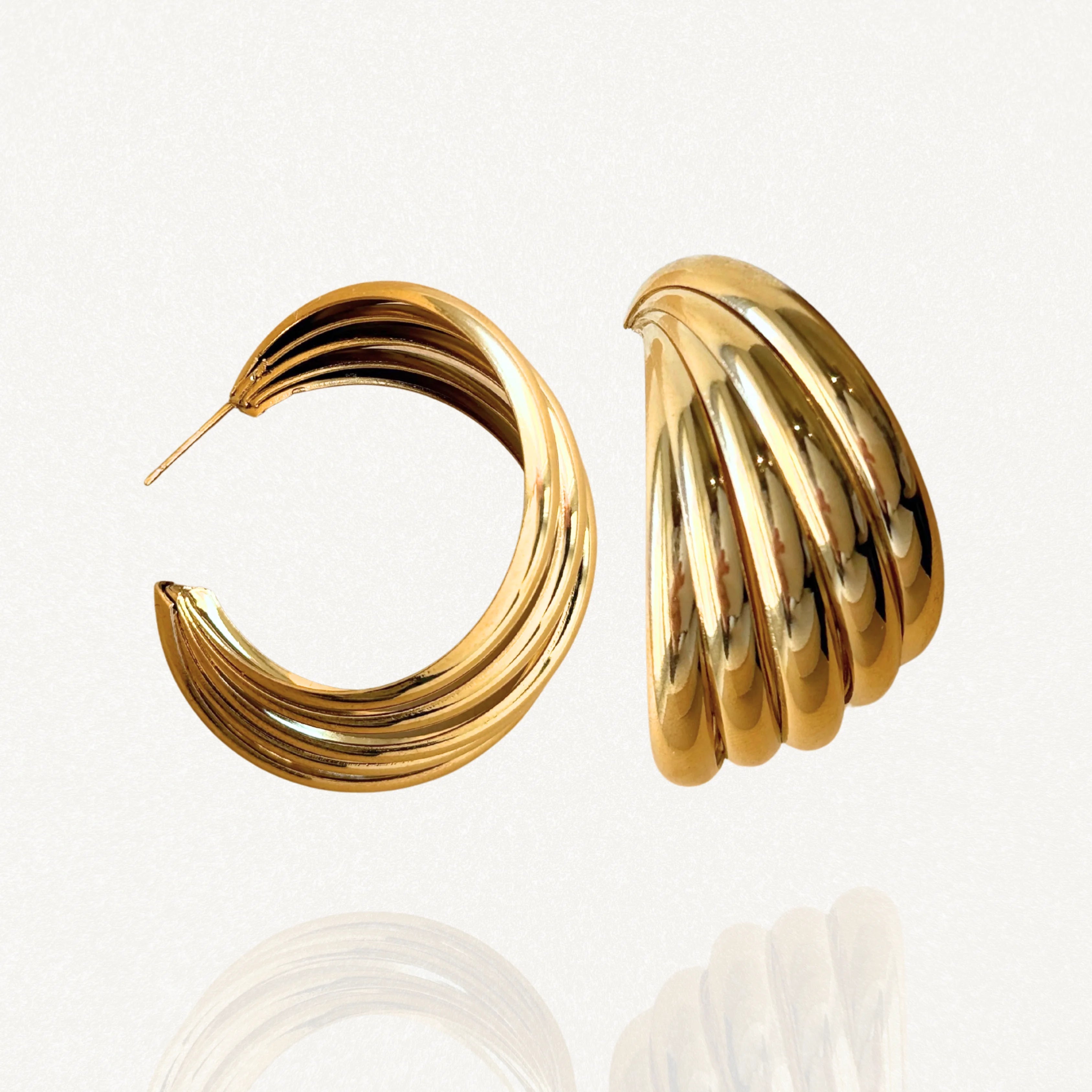 Paires de créoles larges effet triple rangs en acier inoxydable doré, finition brillante sur fond blanc.