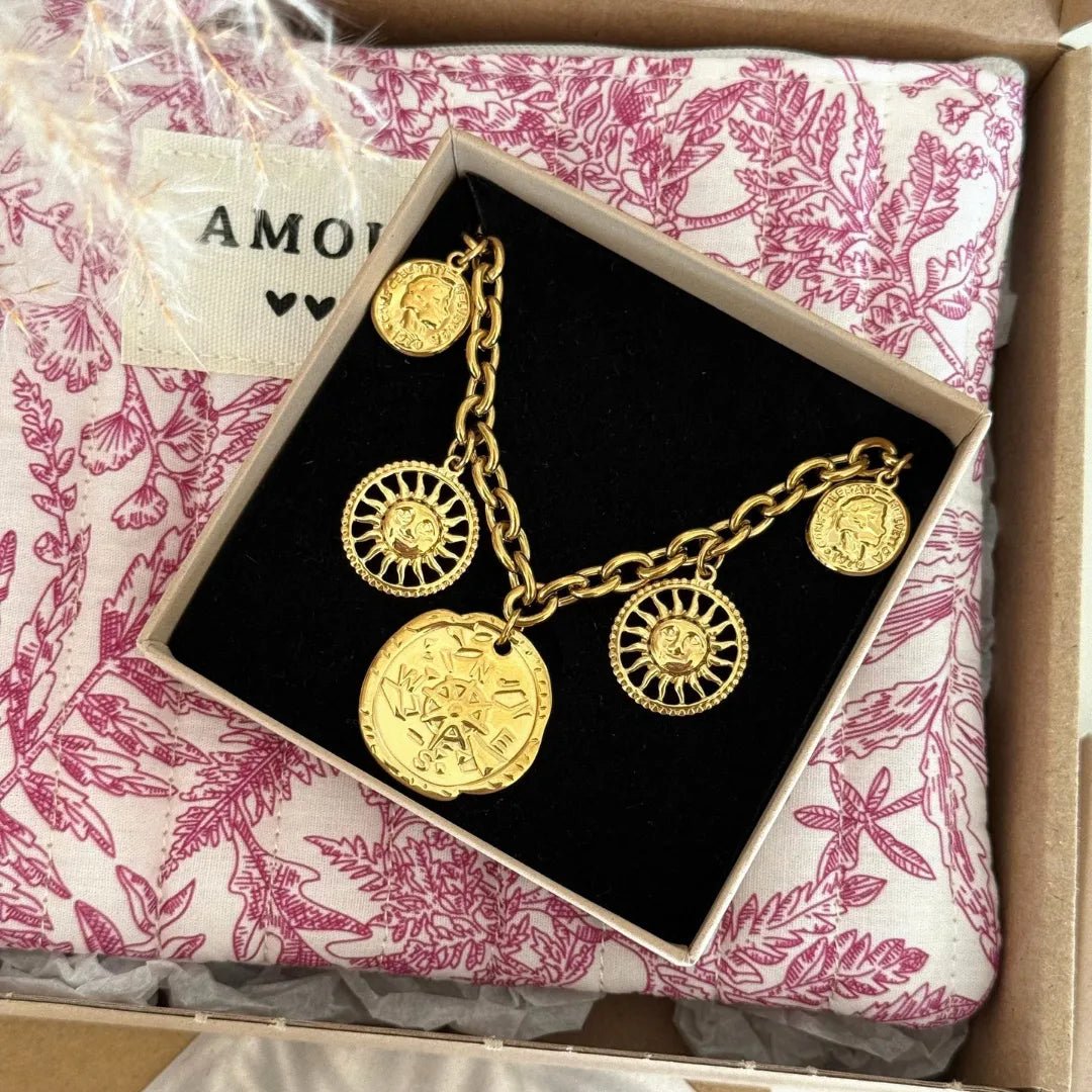 Collier chaîne épaisse dorée avec 6 charms: 2 soleils stylisés et 4 médaillons, dont une pièce antique, sur une femme.